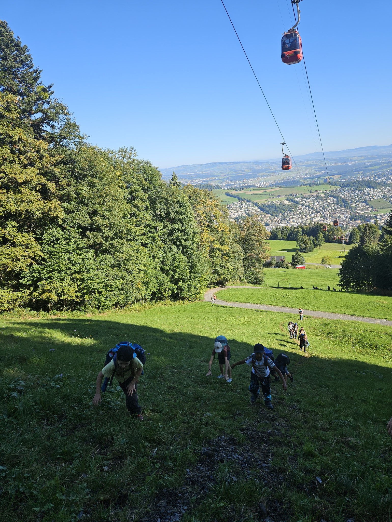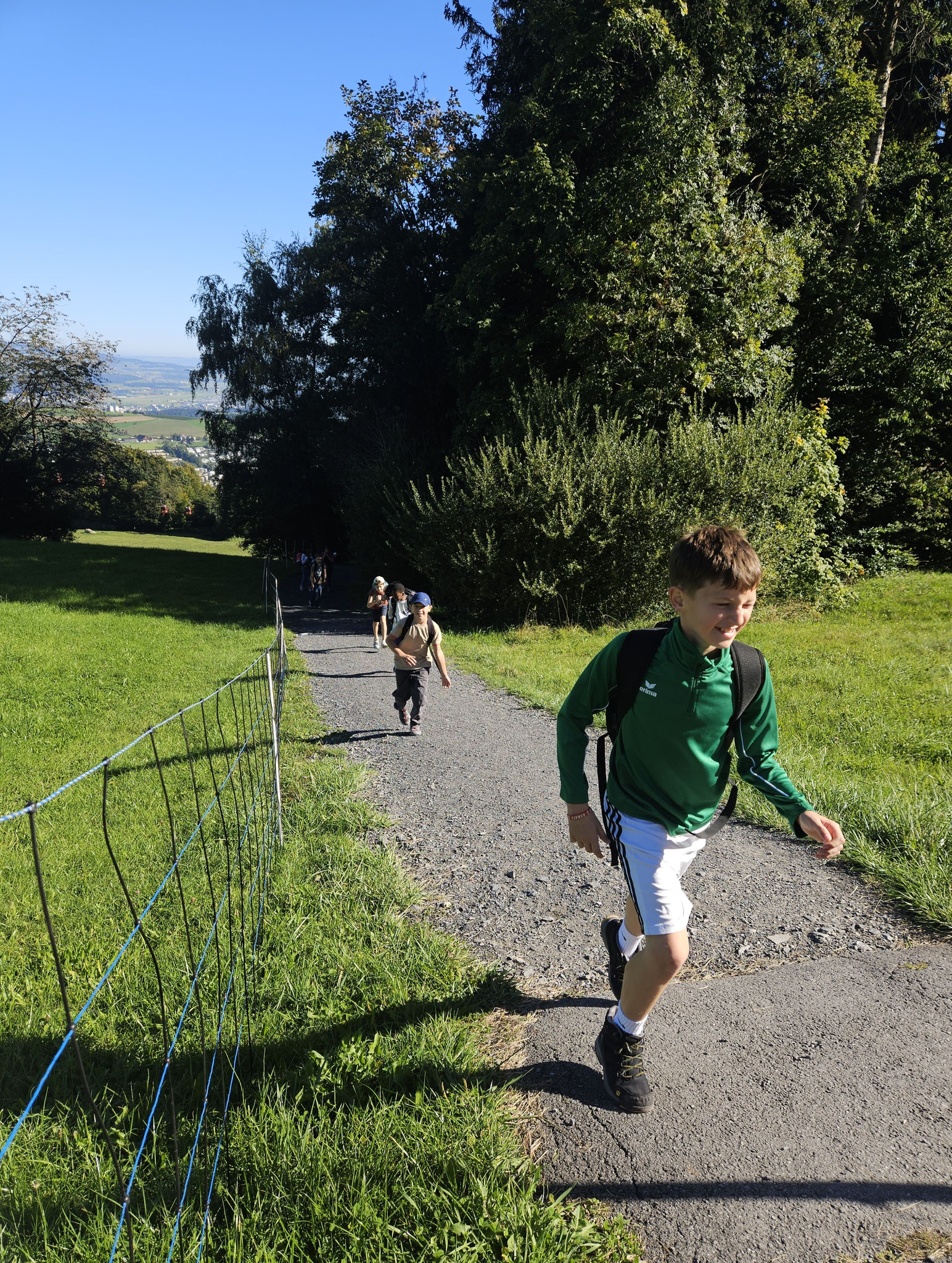 Oben angekommen, genossen die Kinder eine wohlverdiente Mittagspause und erlebten die Natur in vollen Zügen. Der grosse Spielplatz war ein beliebter Treffpunkt, an dem eifrig gespielt und getobt wurde. Die Grillstellen luden zum Bräteln von Würsten und Marshmallows ein und die Schülerinnen und Schüler entdeckten gemeinsam die herbstliche Umgebung. Der Tag war geprägt von typischem Herbstwetter – der Morgen war neblig, aber am Nachmittag schaffte es die Sonne, durch die Wolken durchzudringen.