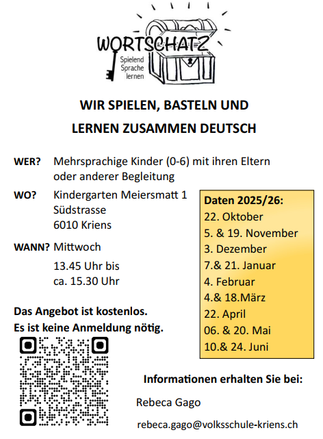 Neu wird das Angebot der Volksschule Kriens von einer spezialisierten Pflegefachperson der Spitex übernommen. Die Eltern von Kindern im obligatorischen Kindergarten, in der 4. und 8. Klasse werden diesbezüglich in der Kalenderwoche 36 (01.– 05.09.2025) genauere Informationen erhalten.